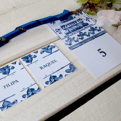 azul azulejo. marcador de mesa. cartões de escolta.