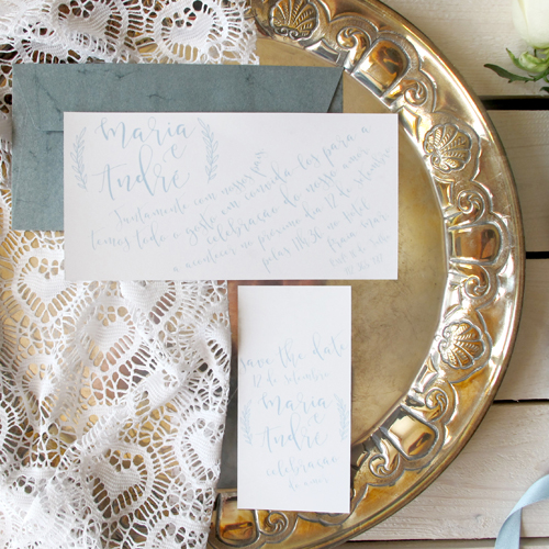 a tranquilidade do azul. save the date. convite. envelope.